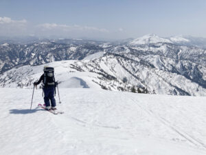 朝一番に急登をクトー or アイゼンで各々登っていく。スズヶ峰から平ヶ岳が見えたが、まだまだ遠い。いくつものピークを超えていく。危険な箇所は1895m峰の雪庇が崩壊している箇所だったが難なく巻いて進んだ。