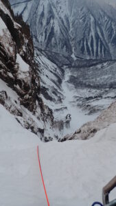 とはいえ稜線ブロック崩壊、上部城塞の雪田からの湿雪雪崩が1発でもきたらお陀仏であることには変わりない。