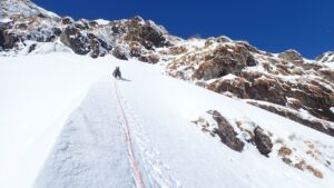 ここからはコンテでスピードを上げる。チリ雪崩フィーバーだが、傾斜はねてきたので顔面直撃はま逃れており、ありがたい。途中右側壁(上部城塞壁の基部)にはでかい氷柱が繋がっている。