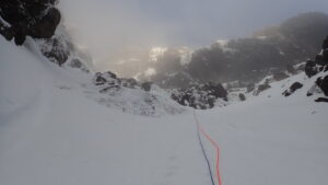 暗闇のシュルンド迷路をウロウロしながらもなんとか2ルンゼ基部あたりまで来たかなーというあたりで、3ルンゼと思われる雪壁にアンザイレンし取り付く。