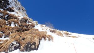 ロープスケールで60mはゆうに越えているだろう。周辺岩壁の雪もすくなくて壁が黒々しておりなかなかの威圧感だ。