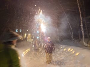 食後は外に出てキャンドルと花火。ビーコン捜索練習の時に、KYさんが何やら雪を掘っていたのはこれか️雪が舞う中、キャンドルに照らされた灯りがほんわかしてて綺麗。雪降る中での花火は情緒あり、と云うか初めてだ。この時期何処で花火売っていたんだろう。KYさんは、かなりのエンターテナーひとしきりキャンドルと花火を楽しんだ後は宴会、いつもの事だが日本酒が美味しい。調子にのって飲みすぎると明日に響くと思いつつ飲んでしまう。暖かいベッドで寝れる有難さを噛み締めながら就寝。