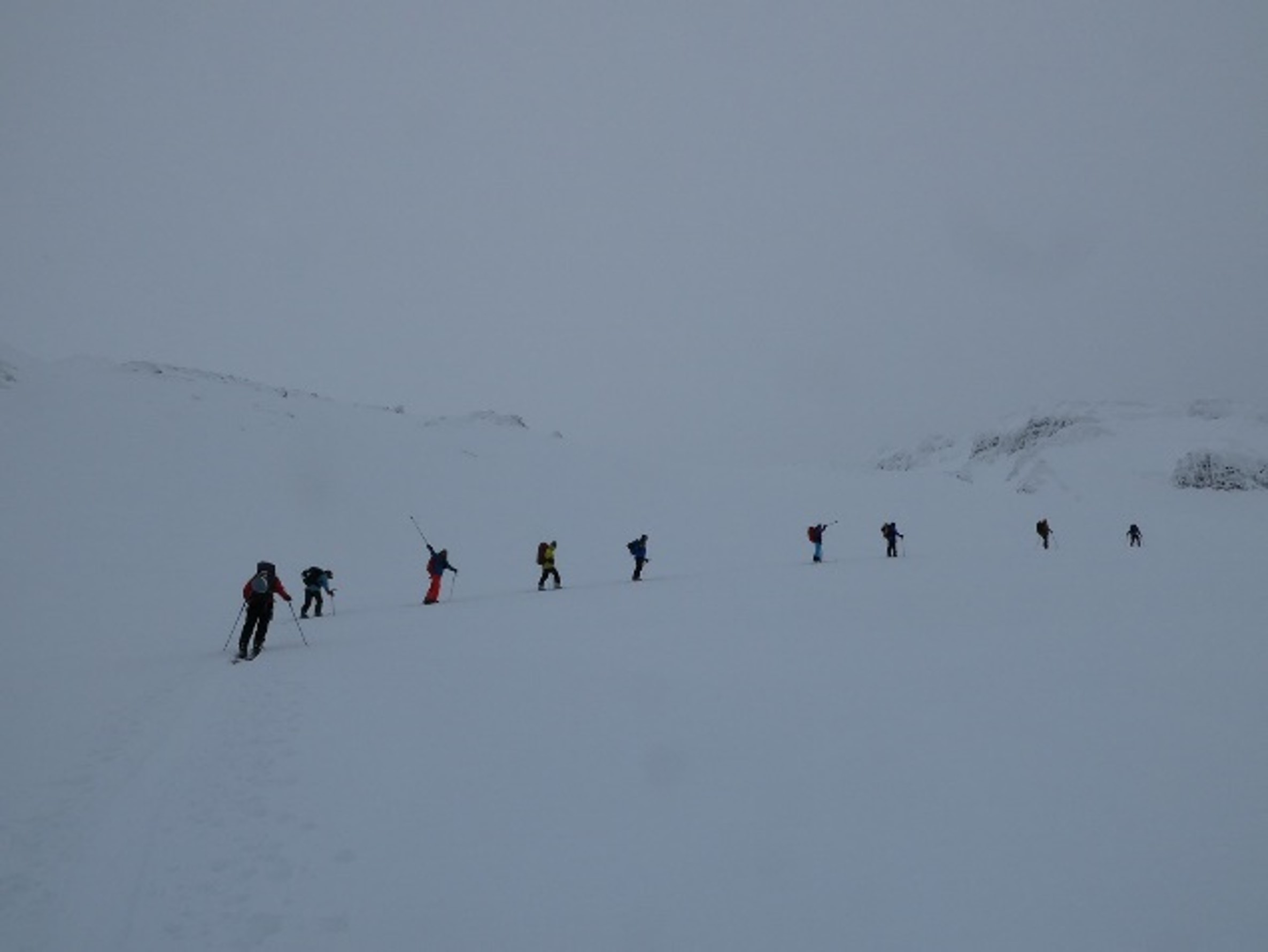 1600m地点辺りから霧が出始めて山頂と男鹿半島を隠し始め天候判断の相談が始まる。結果的に千蛇谷入口付近(1850m)で引き返す判断となる。霧で視界が悪い状況下のスキー滑走はコース選定が難しい。パーティー全体の安全誘導のため何度も先行1名が体を張ってコース下見をしてくれた。