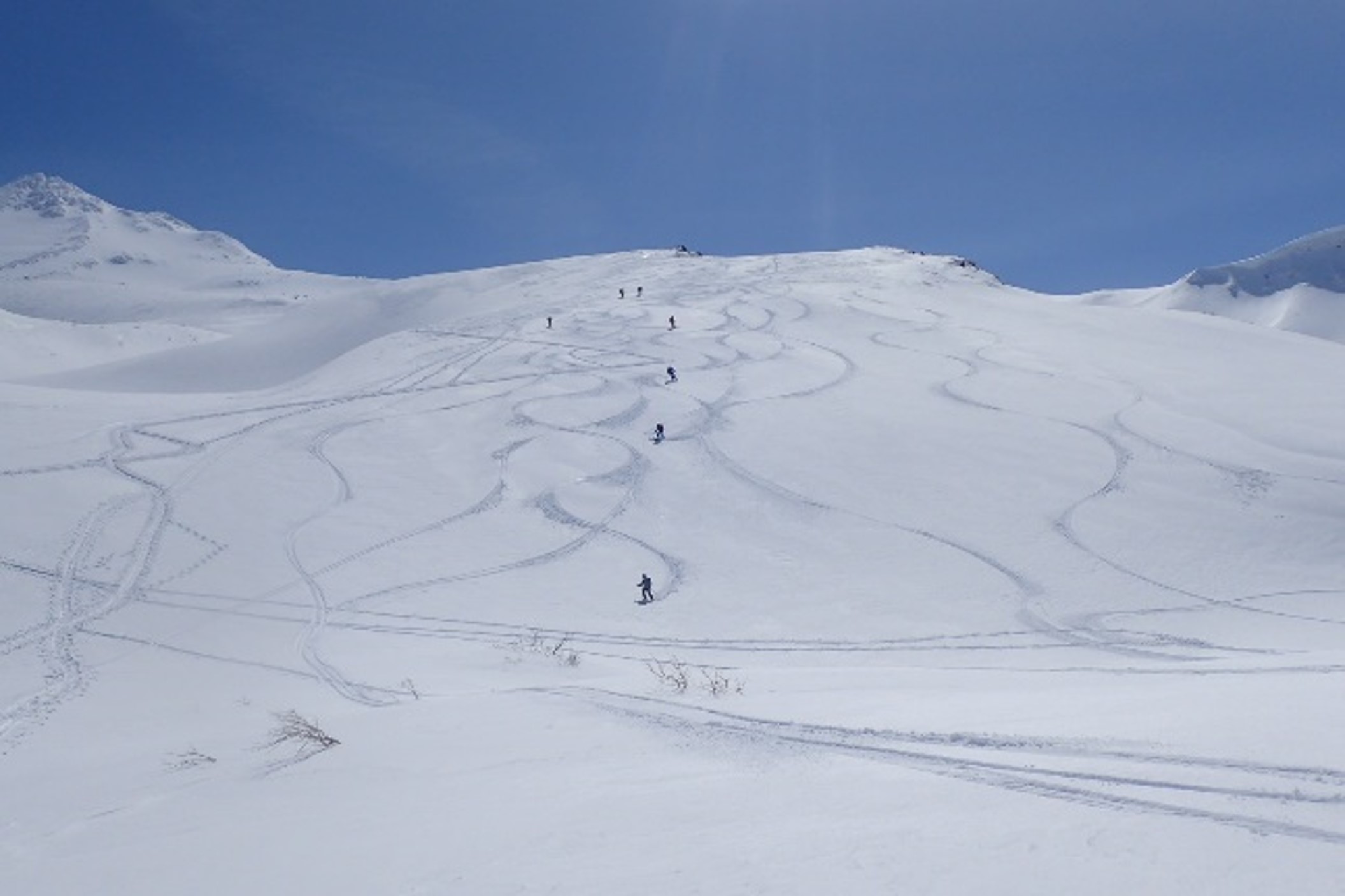 私は傾斜部を慎重に下り、緩傾斜部でゆっくりとウォーミングアップする。滑りやすい良質のバージンスノーに自分のシュプールを繰り返し刻むと次第に気分が高揚してくる。程なくして河村さんと合流する。見下ろすとスキーヤーが次々と登って来るではないか。また振り返ると千蛇谷は我々のシュプールだらけだ。この先もバージンスノーは続く。“雪面全面を我々のシュプールだらけにしよう!”と誰かが吠える。数百メートル毎に滑走と集合を繰り返す。全員が興奮したお祭り状態となり歓声と奇声をあげて滑走、登って来るスキーヤーからの羨望の眼差しを肌で感じる。滑走コースを端から端まで我々のシュプールだらけにしてしまった達成感と罪悪感を満喫する。