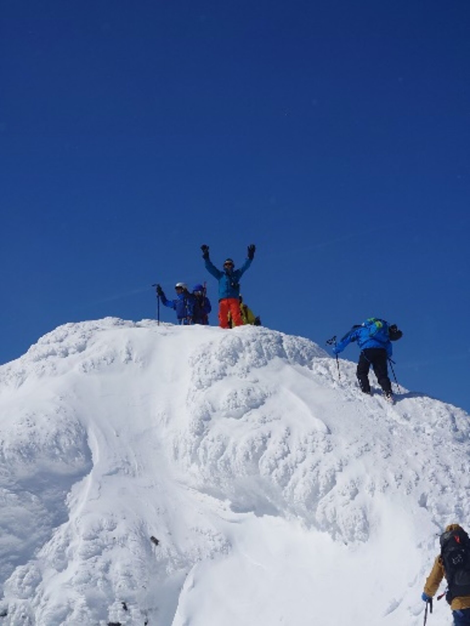 最上部を登り切ると雪に埋まった小屋の屋根が現れる。もう一登りして頂上直下にスキーをデポして5m程登り詰めて頂上に至る。さあメインメニューだ、シールを仕舞い、ワックス掛けしてブーツとビンディングを滑走モードにする、スキー滑走開始だ!