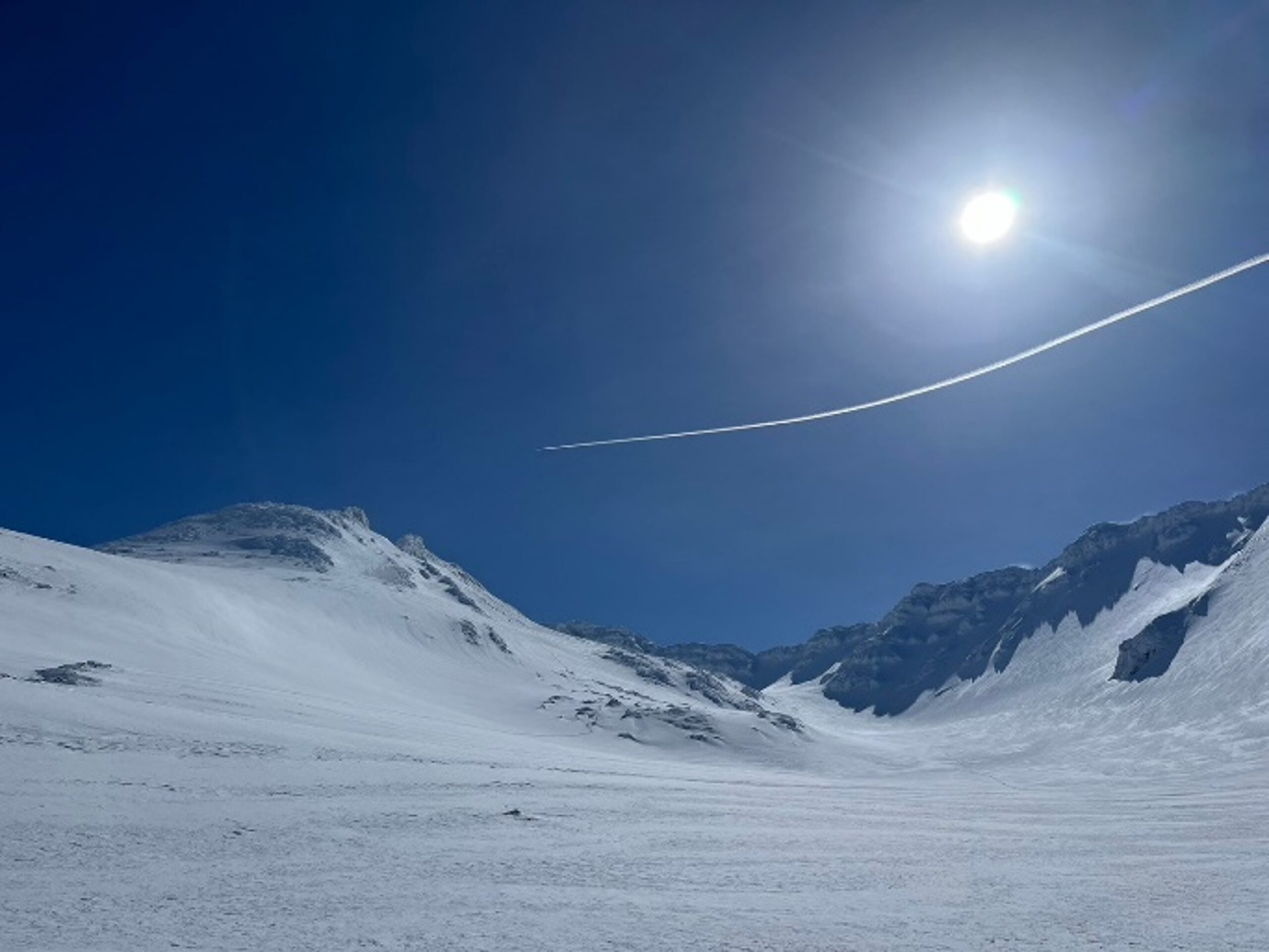 快晴だ、日焼け止めを有難く借用塗布し、いよいよ千蛇谷のハイクアップが始まる。千蛇谷はスキー場のゲレンデのように広い緩斜面が長く続き、最上部は少し傾斜が立っている。雪面は綺麗で、見渡す限り人工物は中央にスキーハイクのトレース一筋と左側に直登するワカンの跡が見えるだけ。更にブルースカイに飛行機雲が伸びていく、爽快だ!