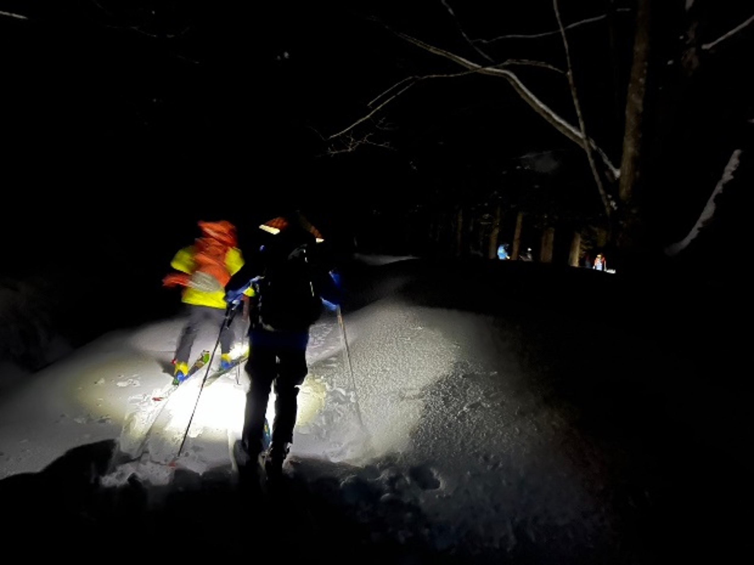 一人ずつビーコンチェックを受けてから入山し暗闇の樹林帯をヘッ電歩行する。2時間程で細尾根に取り付くと薄明りの中に山頂が遠望できて気分が高揚する。更に進んで台地に上がってから振り返ると日本海と男鹿半島を見下ろすことができる、スキー滑降時の景色としては最高である。
