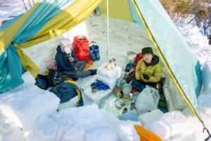 内側に傾斜をつけて、これでもかと中に張り出しながらブロックを重ねて屋根ができた。ガサツな自分は一人じゃ作れないなと肩を落とした。最後に3人くらい横になれるように中を広げて純イグルー完成。風が入らなくて雪の中は暖かい。
