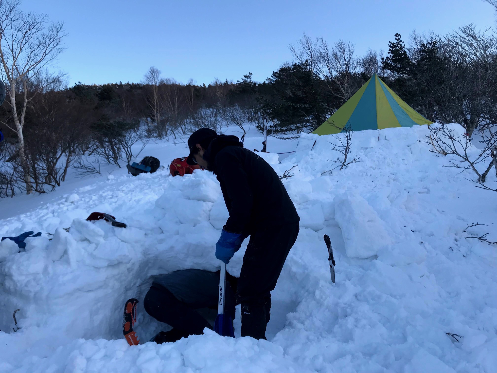 内側に傾斜をつけて、これでもかと中に張り出しながらブロックを重ねて屋根ができた。ガサツな自分は一人じゃ作れないなと肩を落とした。最後に3人くらい横になれるように中を広げて純イグルー完成。風が入らなくて雪の中は暖かい。