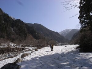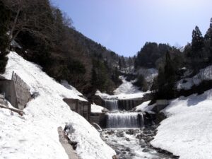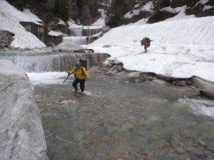 取水口にて、行きに使ったスノーブリッジは崩れ去っておりあえなく渡渉した。