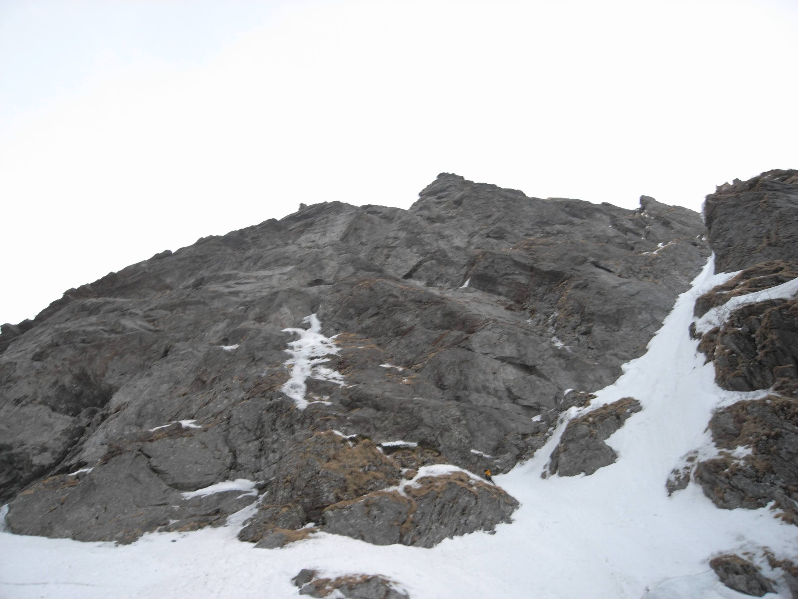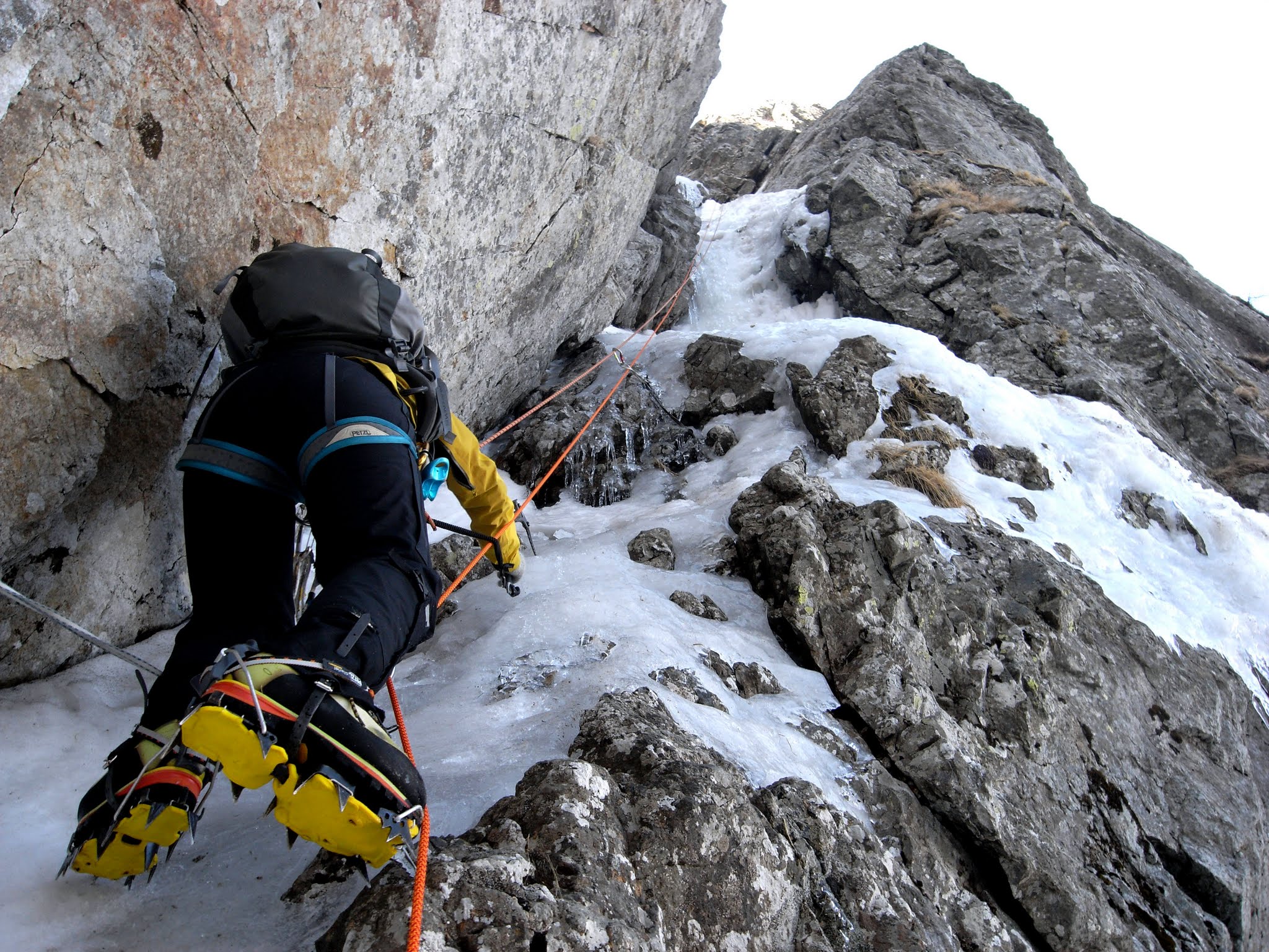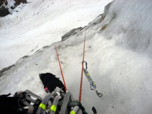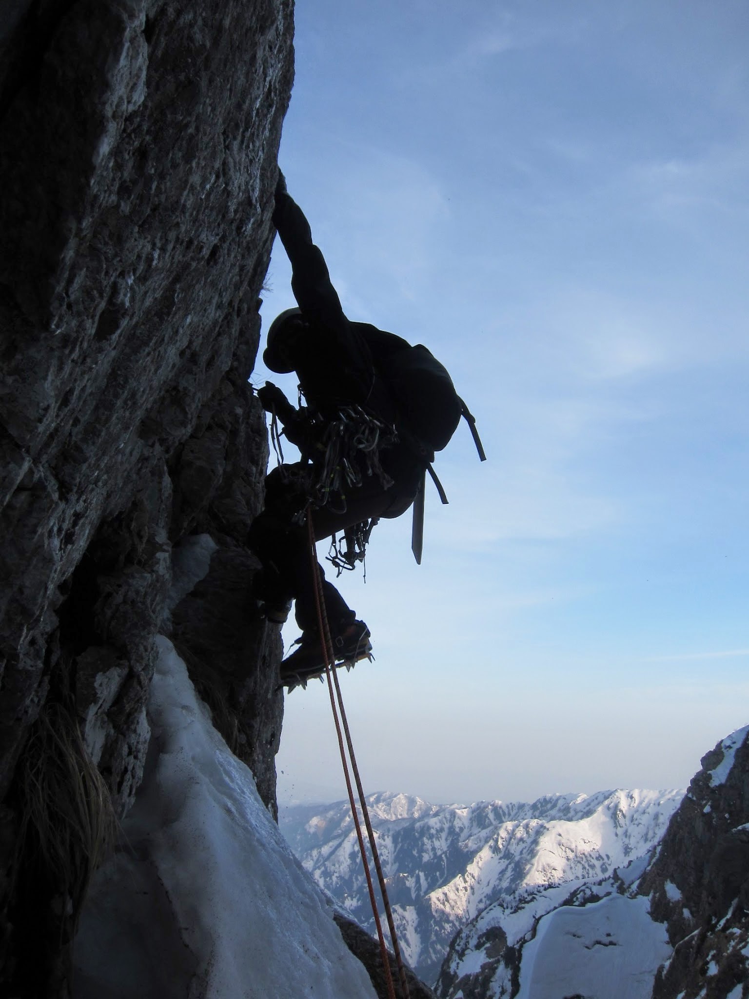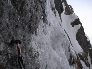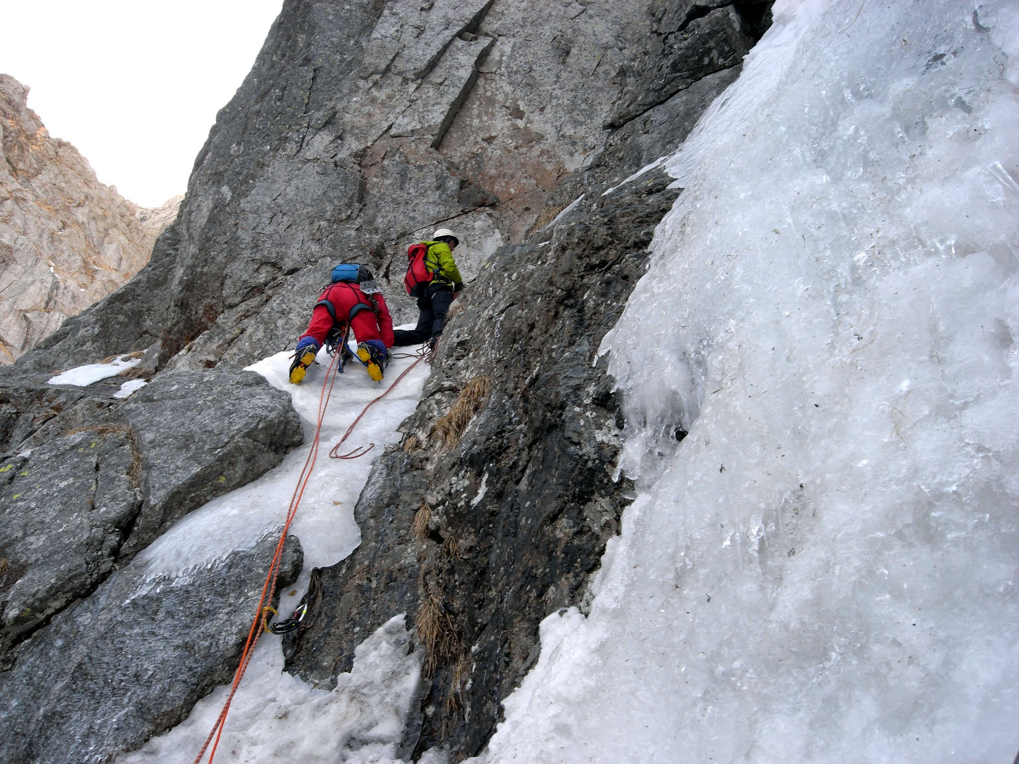 5:00 R4取り付き。1P目はカンテを回り込んで氷に取り付く。