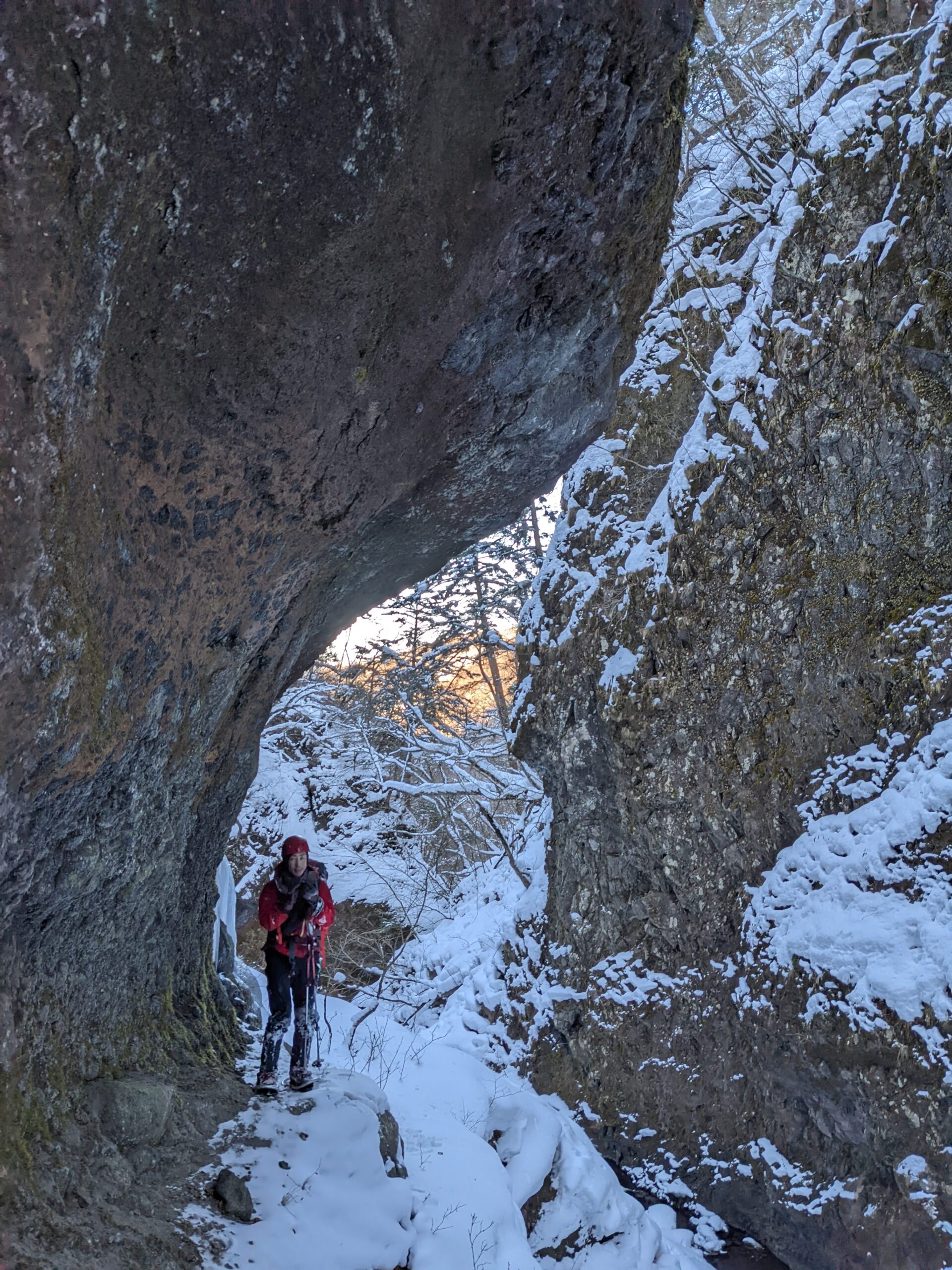 熊穴沢の偵察。地形図上の最狭部。側壁をくり抜いたような側壁バンドを歩く。