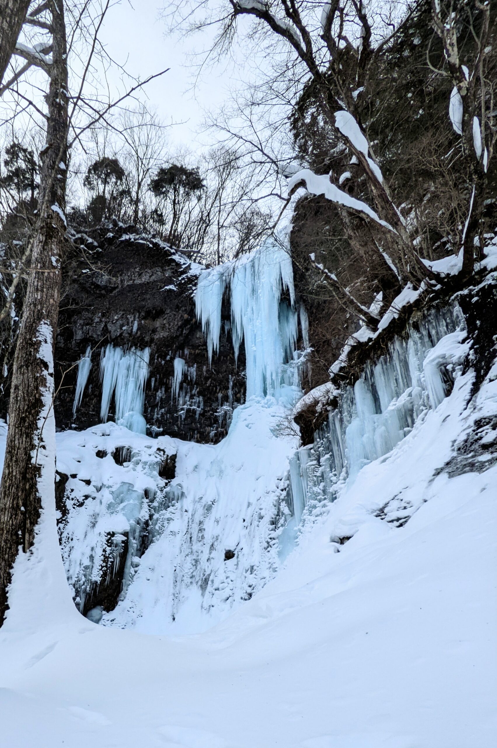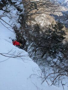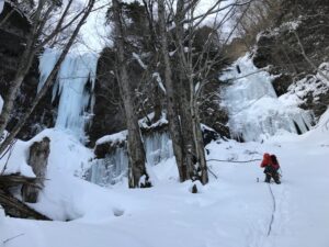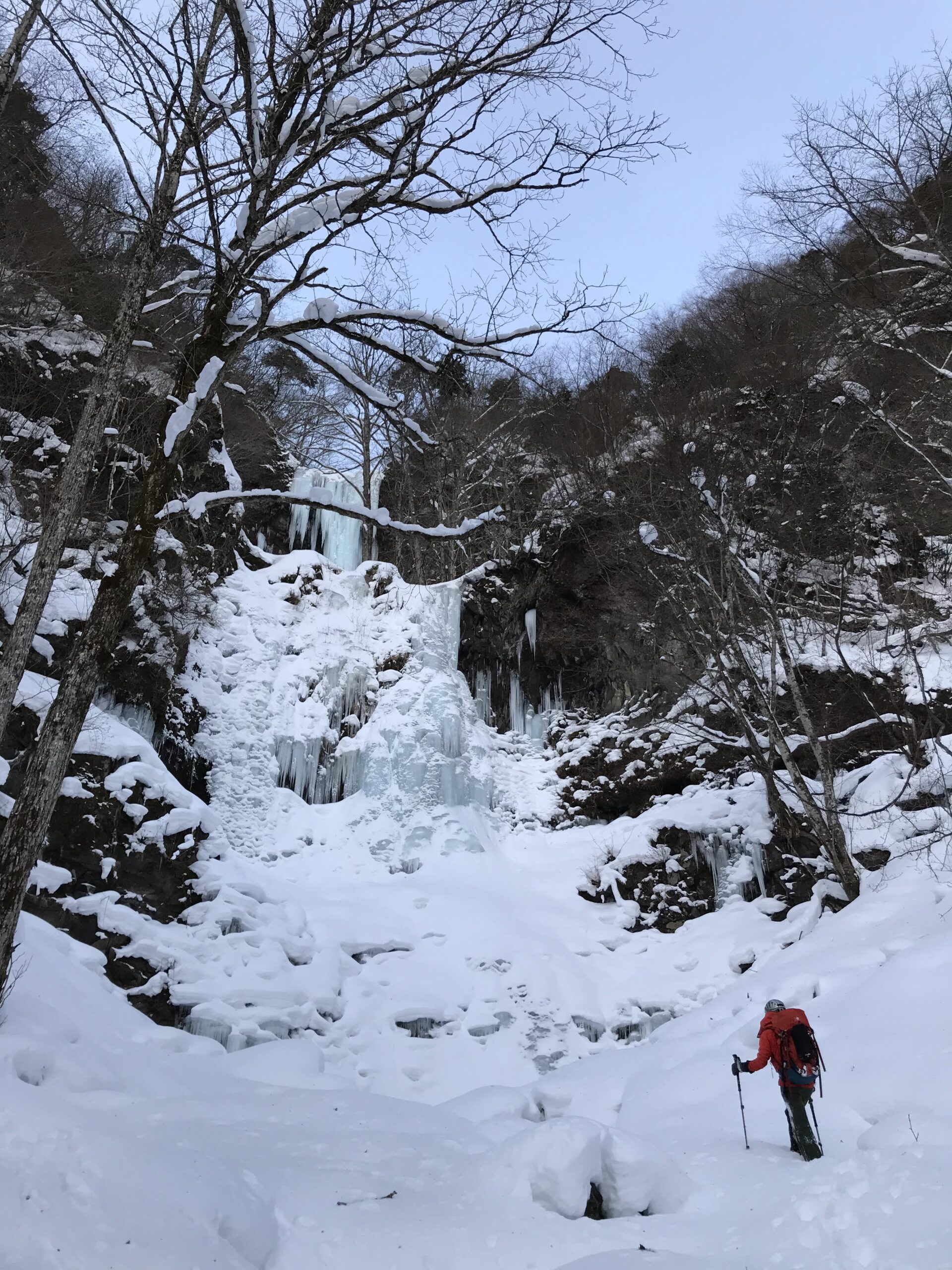 この裏熊穴沢(仮)に入って前衛滝までの道中、左岸の木々の隙間から氷爆の頭っぽいのが見えていたので、もぐもぐラッセルすること30分。なんと悪そうな滝が現れたのである。