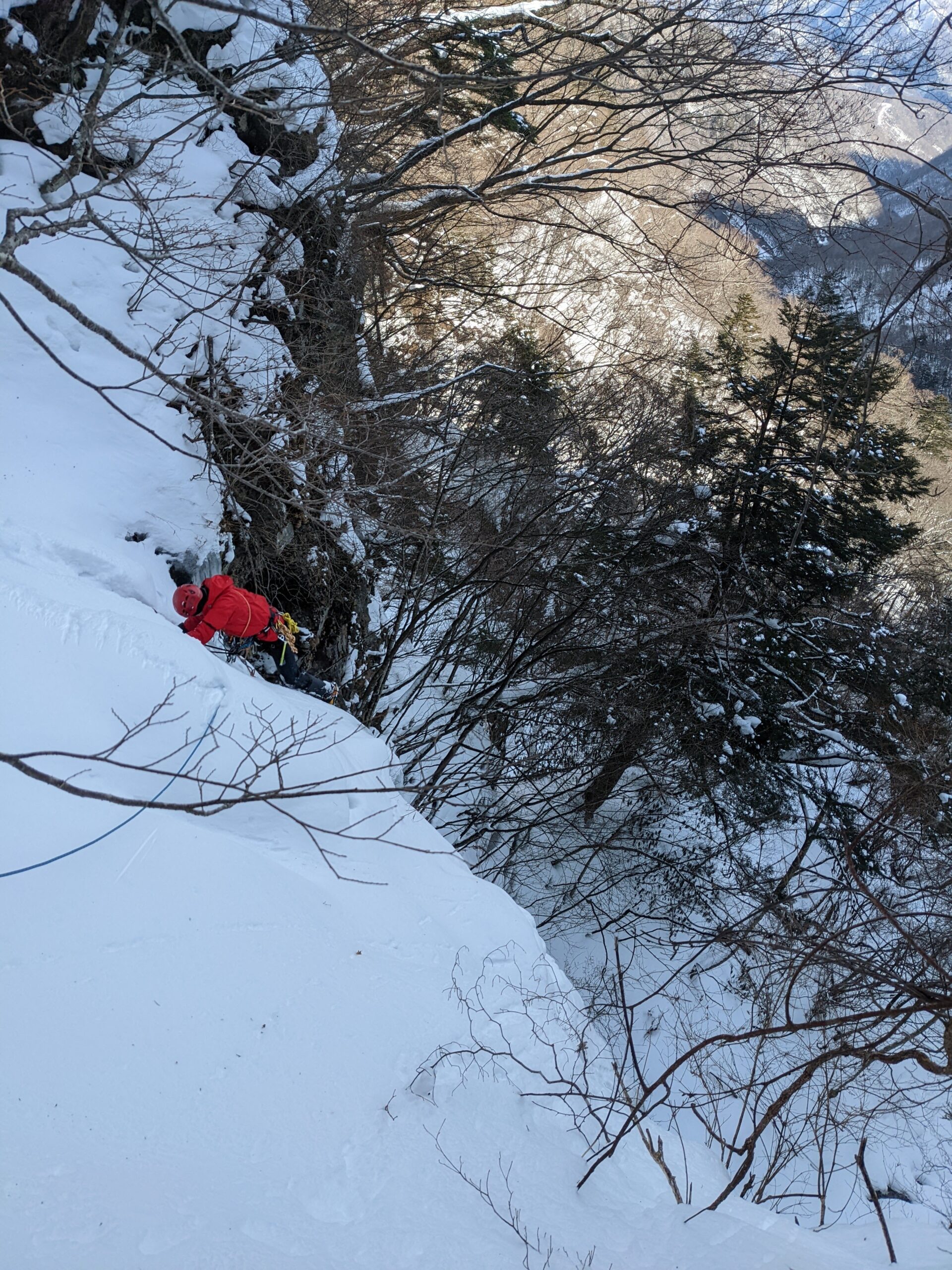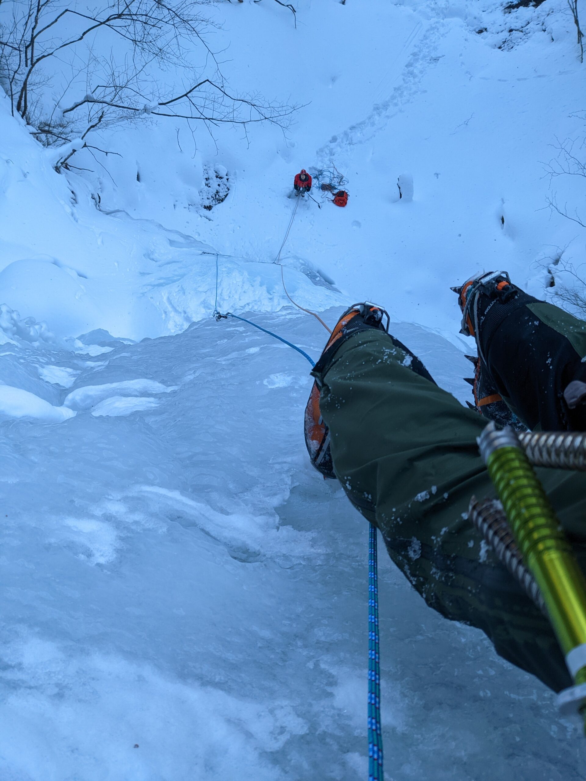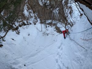 40mほどで右岸の灌木で終了。細引き巻いて下降。
