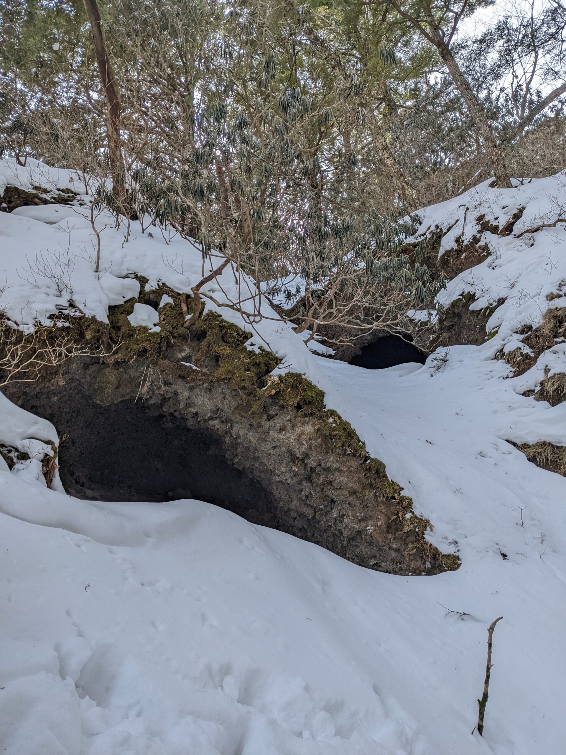 見上げると岩小屋が2つ並んでいた。熊親子の寝蔵かな?