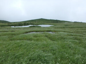 松仙園に到着すると心地よい微風、整備された木道や湿原が現れる。生憎永山岳などの稜線はガスで展望は利かない。三ノ沼でいったん湿原は切れるが、沼ノ平では更に霧の中に多くの沼が現れ、癒しのひと時である。人気は全くなかった。