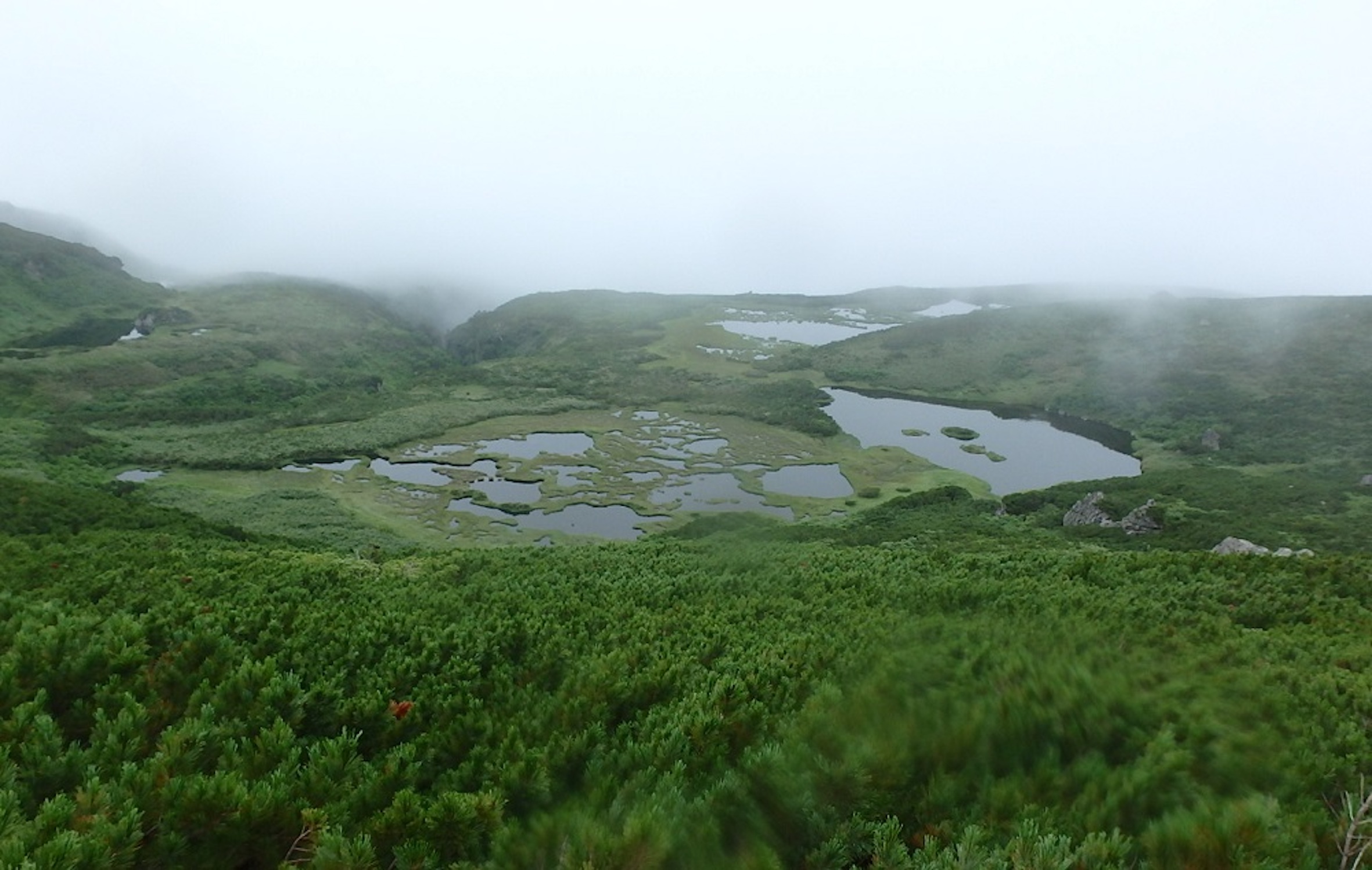 松仙園に到着すると心地よい微風、整備された木道や湿原が現れる。生憎永山岳などの稜線はガスで展望は利かない。三ノ沼でいったん湿原は切れるが、沼ノ平では更に霧の中に多くの沼が現れ、癒しのひと時である。人気は全くなかった。