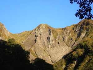 登山道から眺められるフトンビシ岩峰群。正面のルンゼを中心に、左側が中央稜。中央稜は中間部で2つの支尾根に分かれており、我々は左側の支尾根から取りついた。