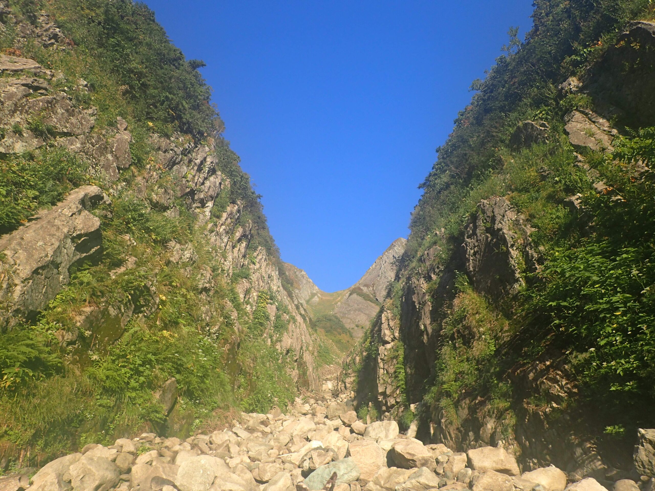 登山道から沢に入ってゴーロ帯を歩くと両岸狭まる