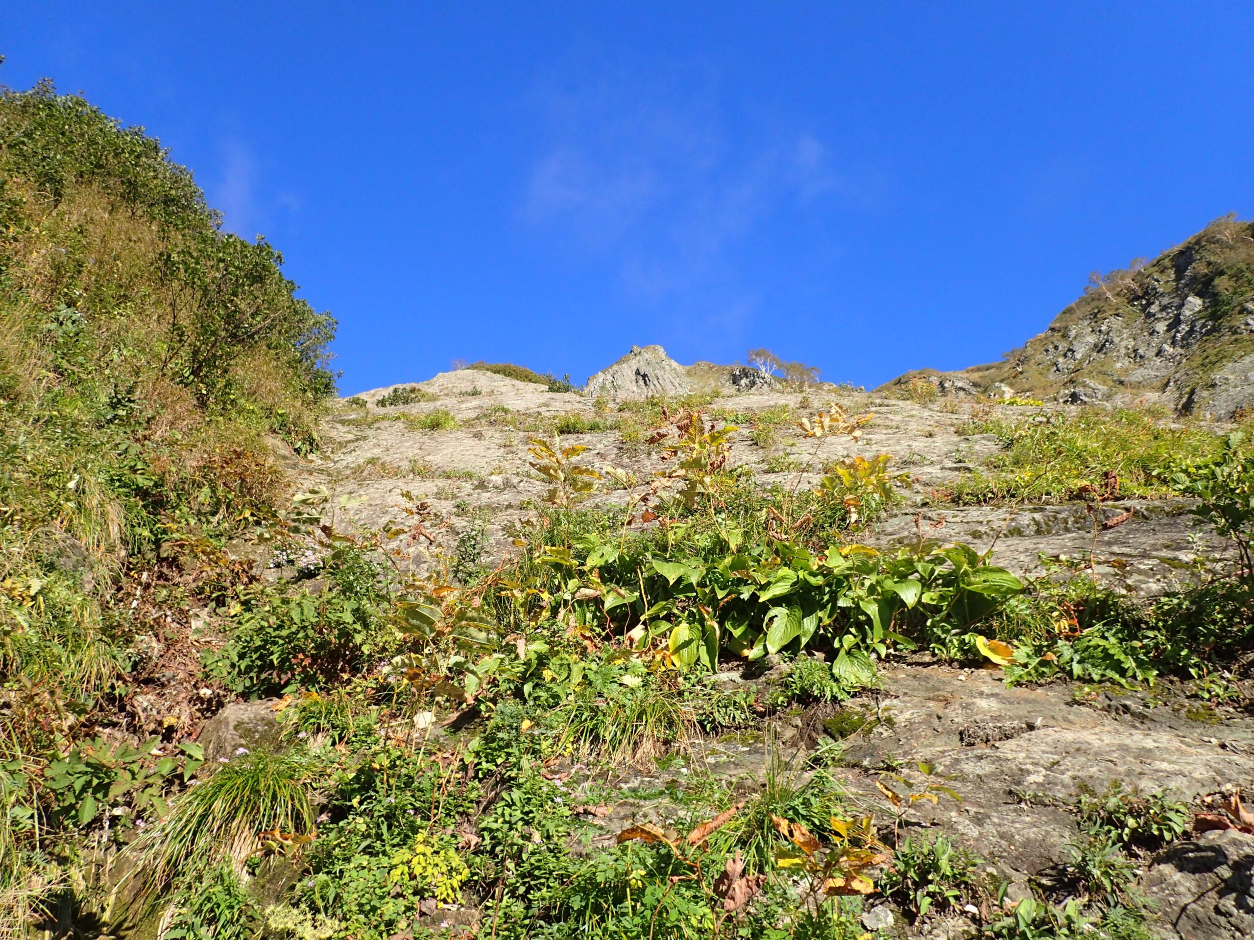 登山道が荒菅沢を横切るところで沢に入る。終始濡れることはなく、そこを通過すると開けたゴーロ帯となり、中央稜に伸びるスラブへと変化していく。自分たちは中央稜の支尾根に乗ったようだ。
