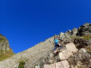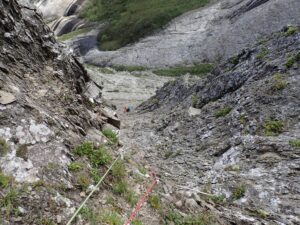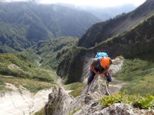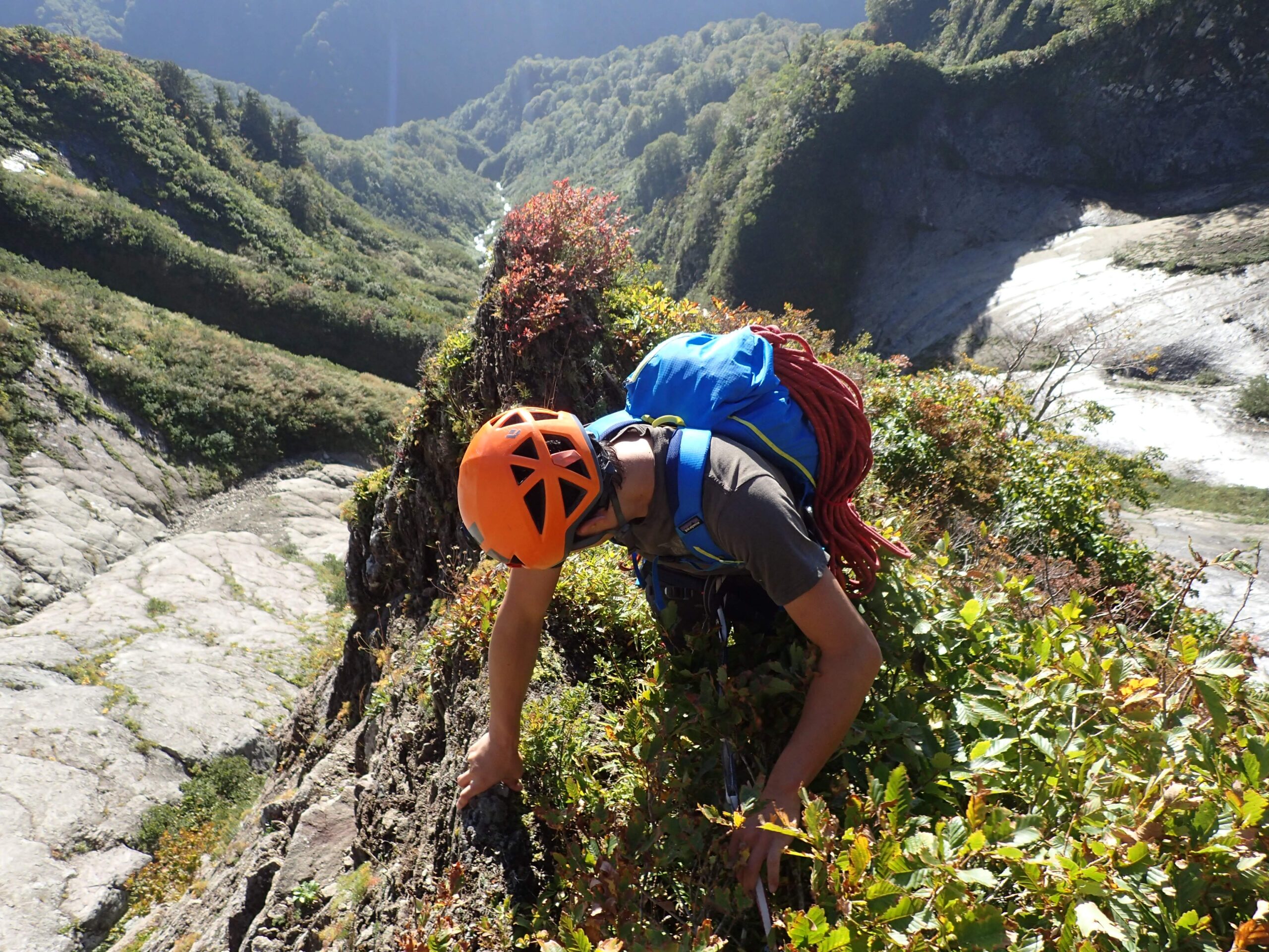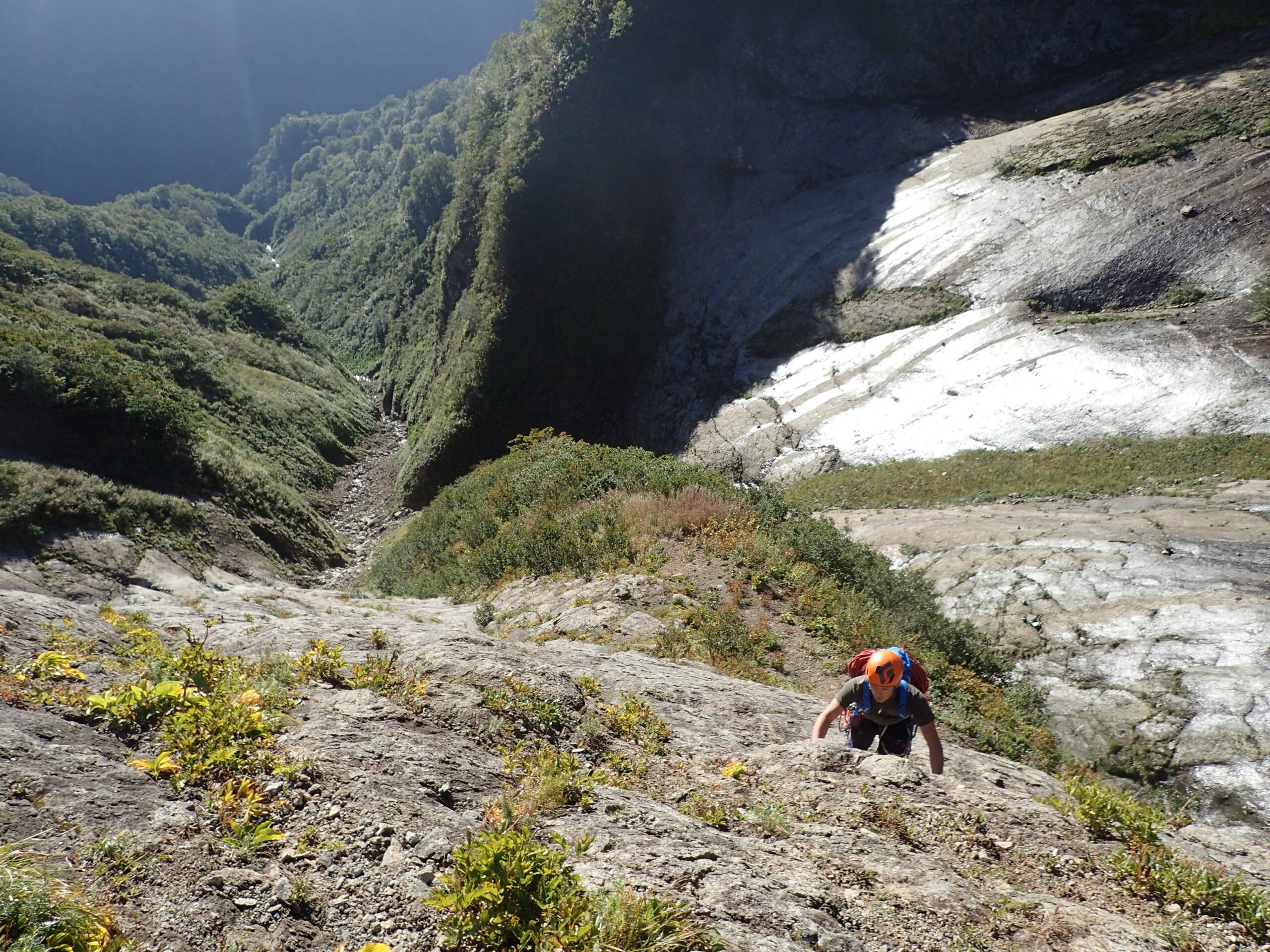 斜面を懸垂後、ルンゼ状を目指してトラバース。