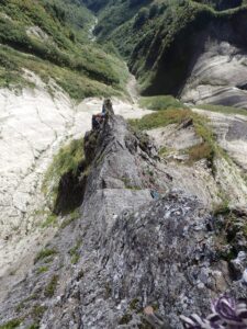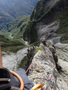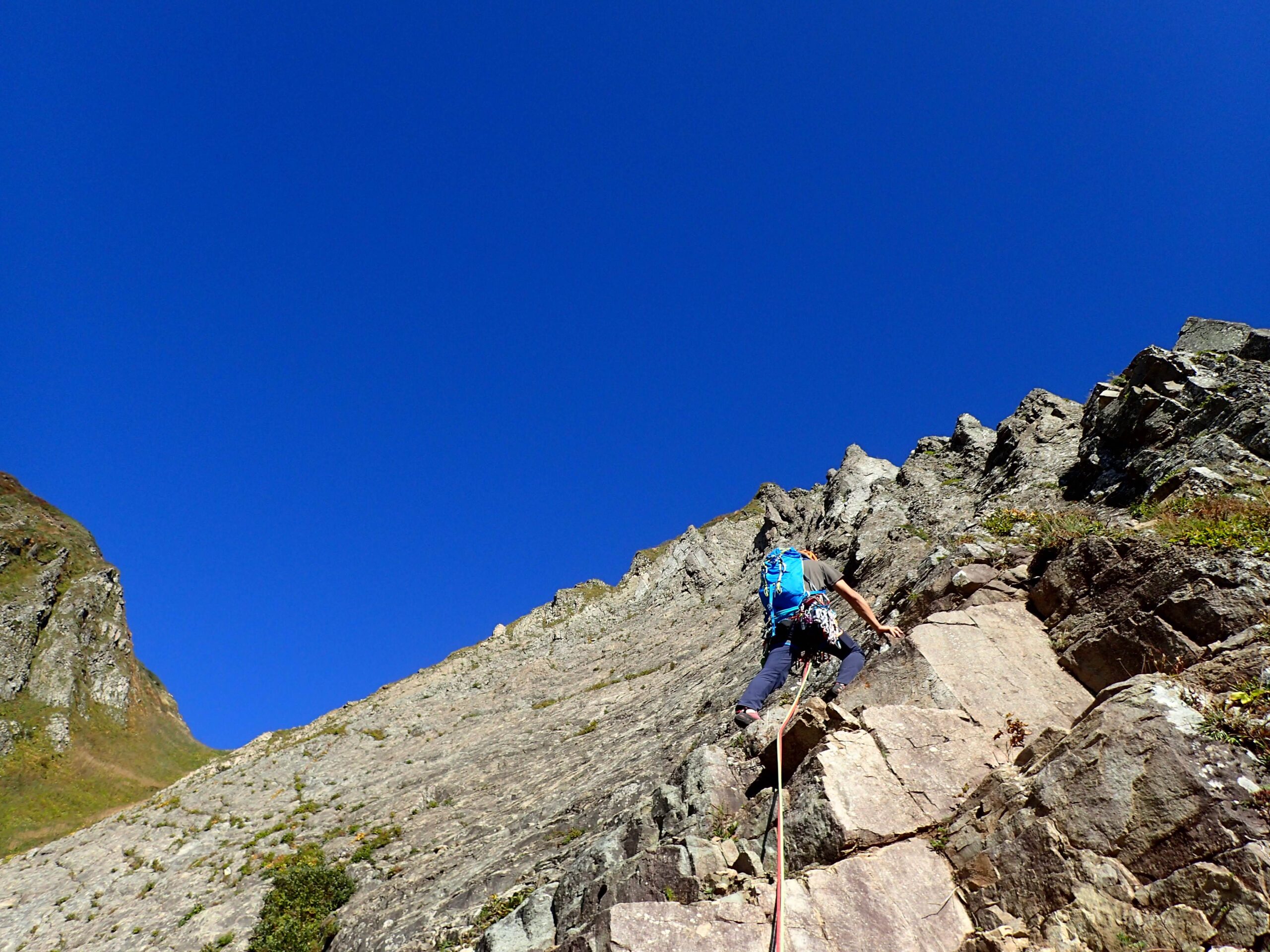 パリパリ剥離していくフレークの岩肌も、鋭く尖ったナイフリッジの馬乗りも、信用ならないピナクルへのランナーを取って落ちるならば右左どっちみたいな考えが巡ってしまうのも、山登魂 鮎島氏の表現そのものでした。