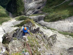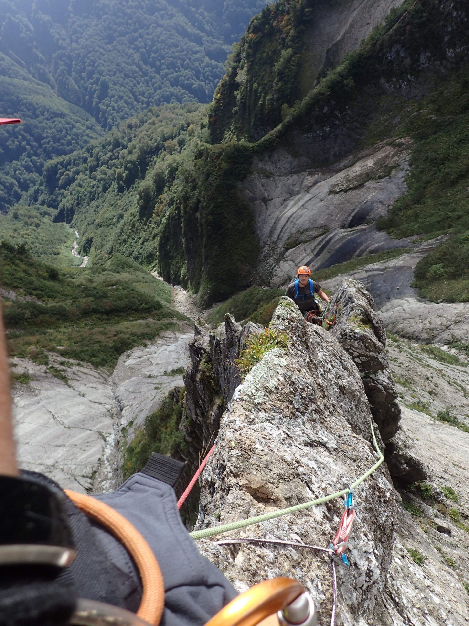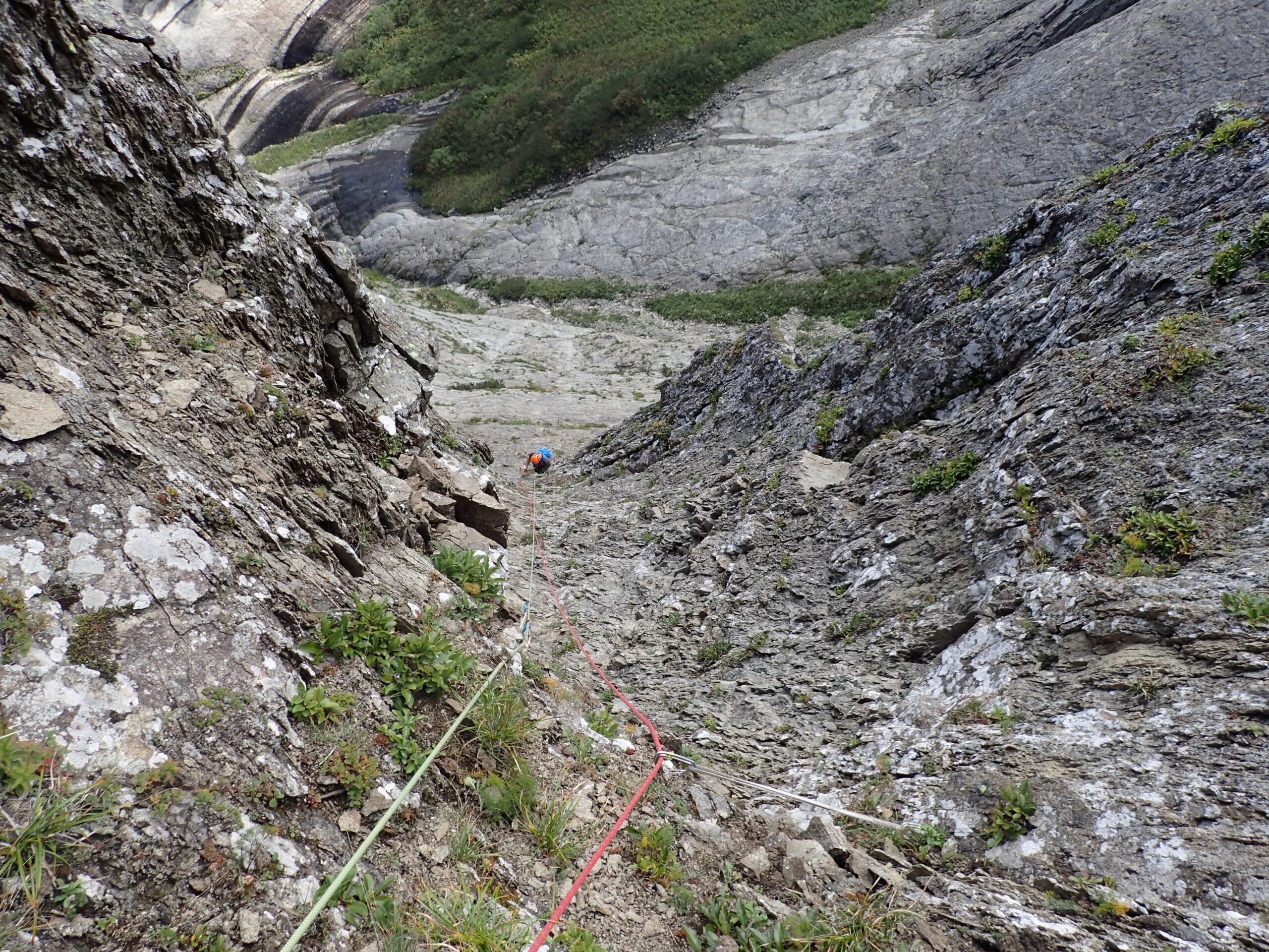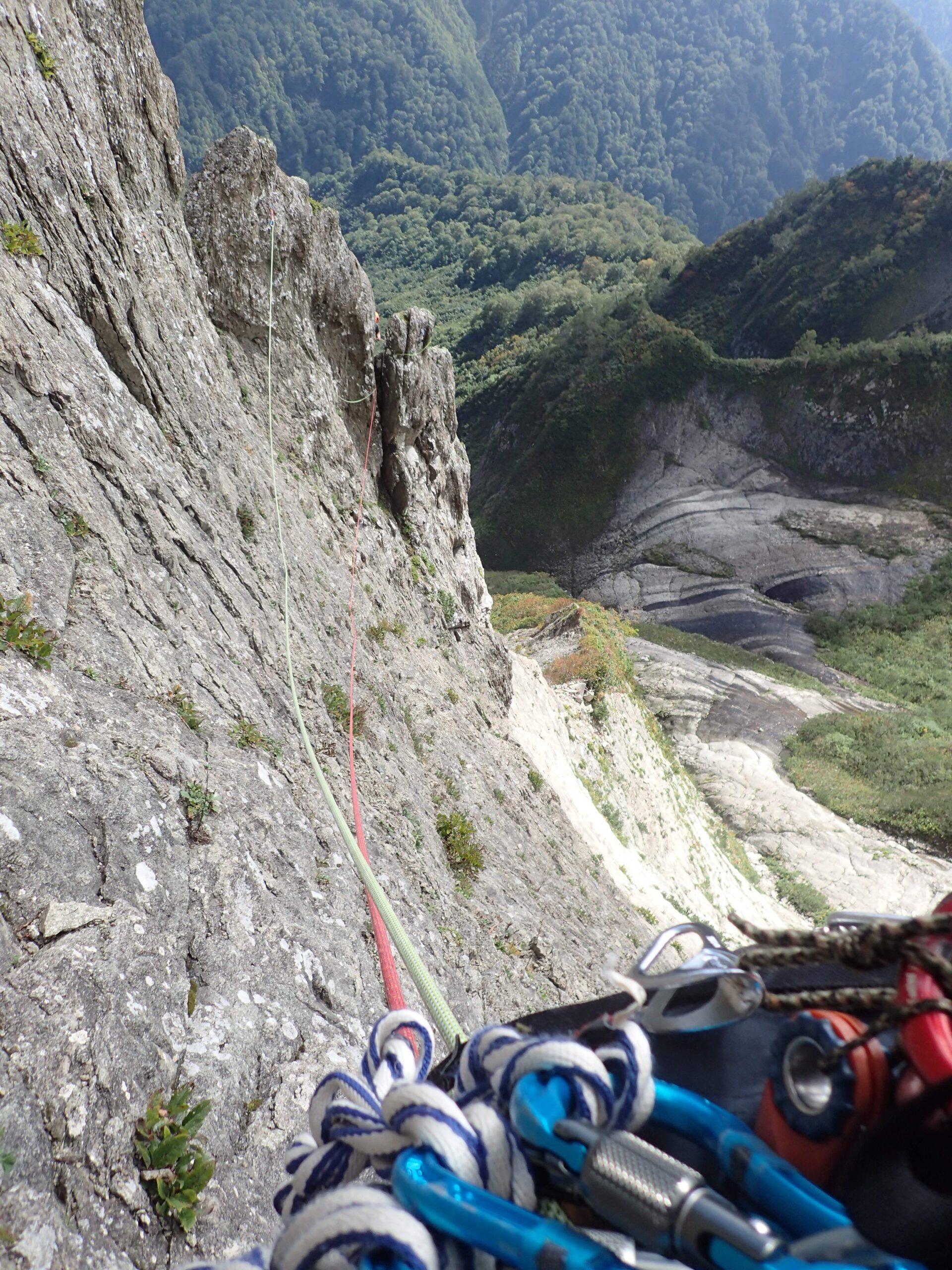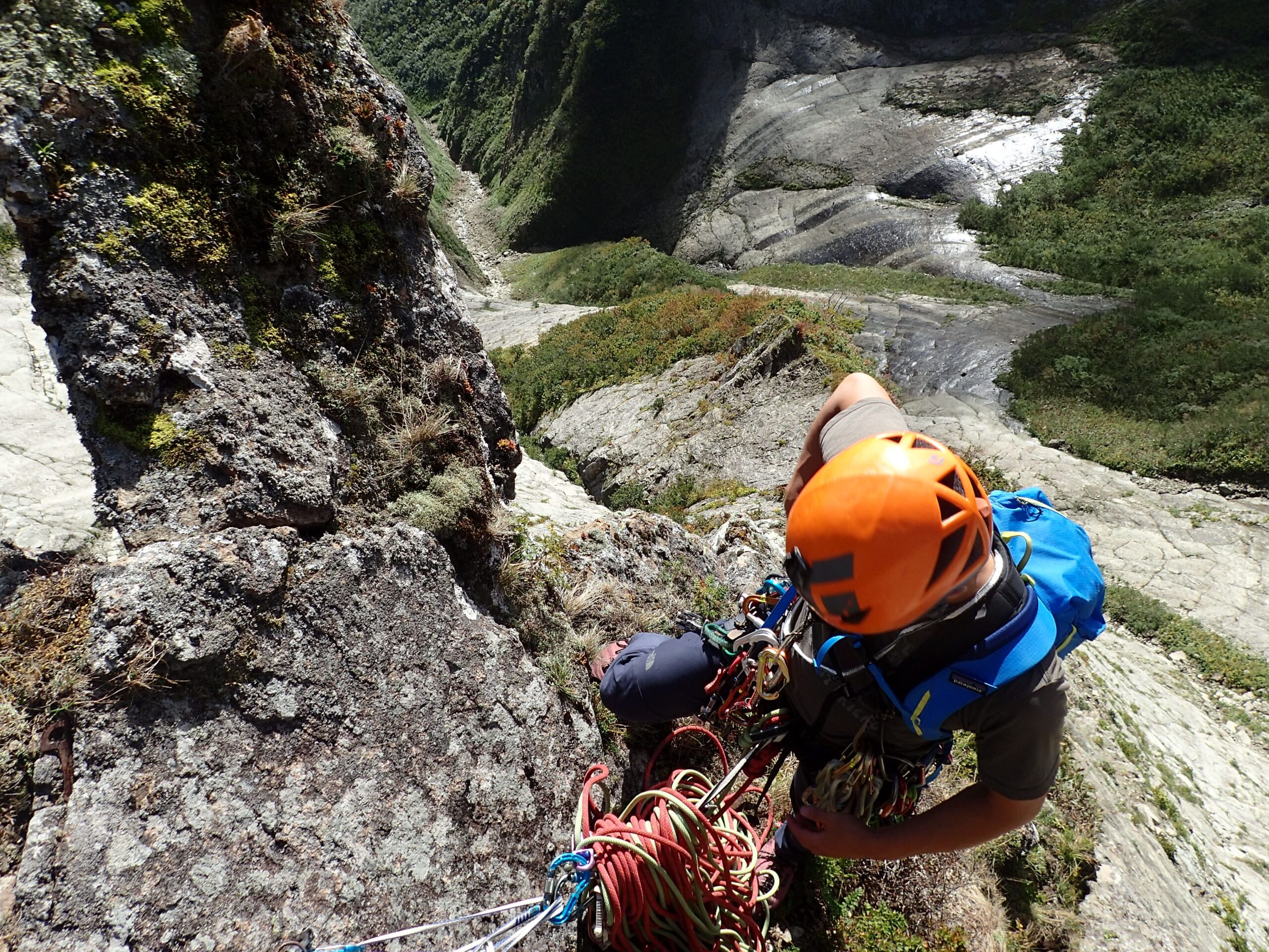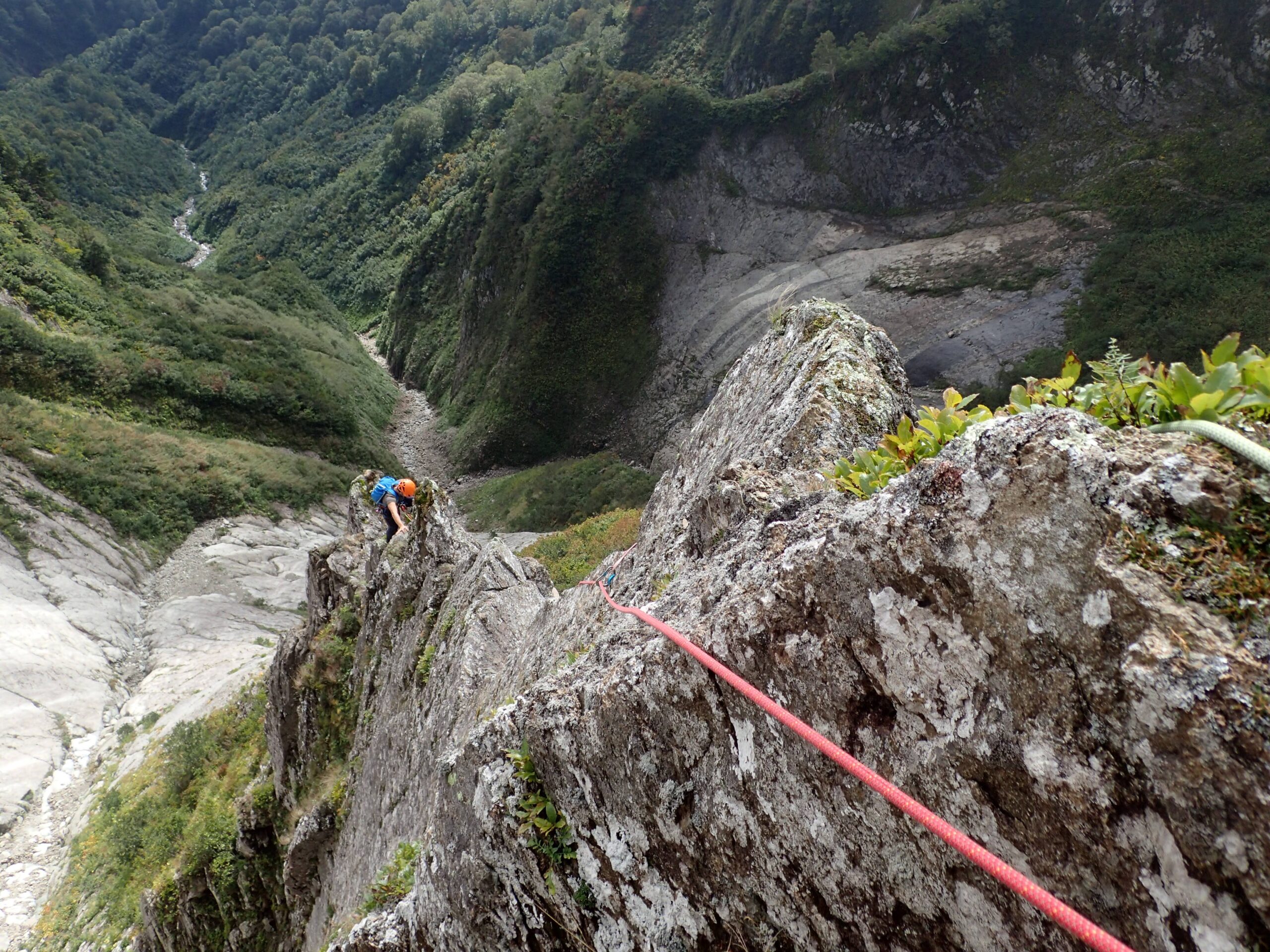 ということでリッジの左側に5m程懸垂し、このセクションを回り込むようにこの巻き上がることにした。